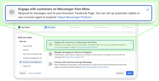 - At https://developers.facebook.com/ go to 'My apps' and select the app. Then go to 'Use cases' → 'Configuration'