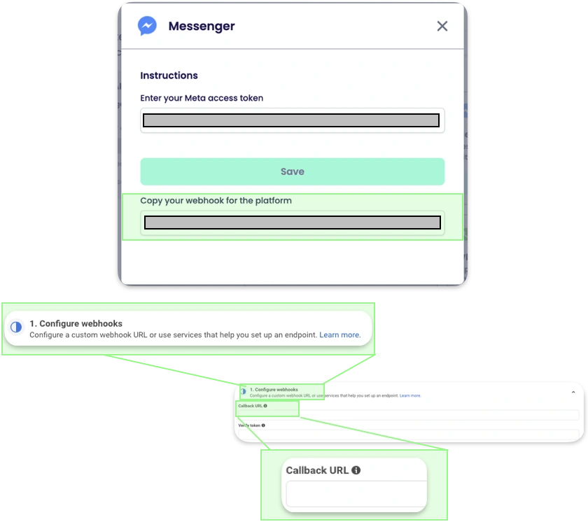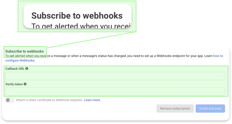 - In Nubion, click 'Configure' again on the WhatsApp card and copy the 'webhook for the platform' to paste it into the 'Subscribe to webhooks' section under 'Callback URL'. Do the same for 'verification token'.