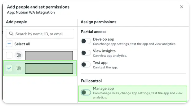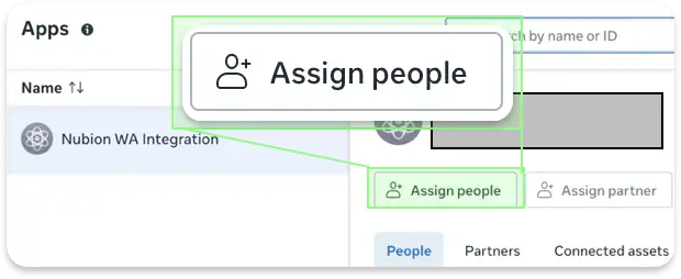- Select 'Generate token' and configure it by selecting the created app, the option to never have it expire, and the permissions 'whatsapp_business_management' and 'whatsapp_business_messaging'.