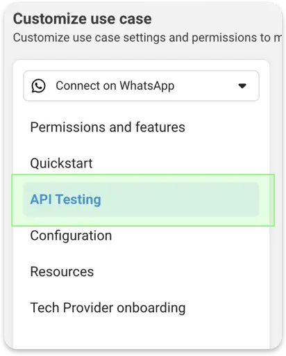 - Go to the side menu and select 'API Testing' to test that WhatsApp messages are being delivered correctly.